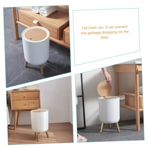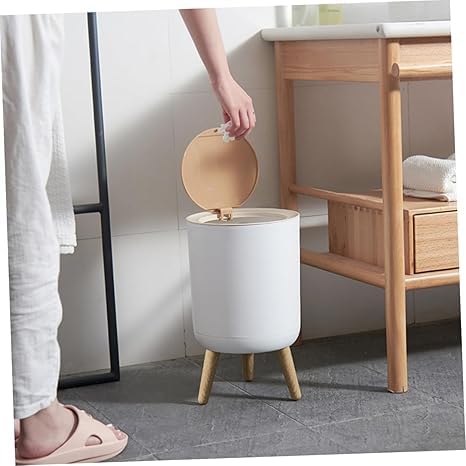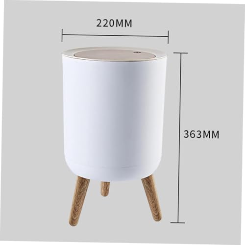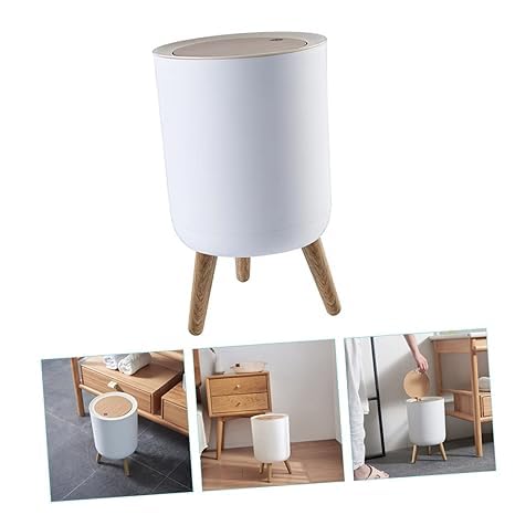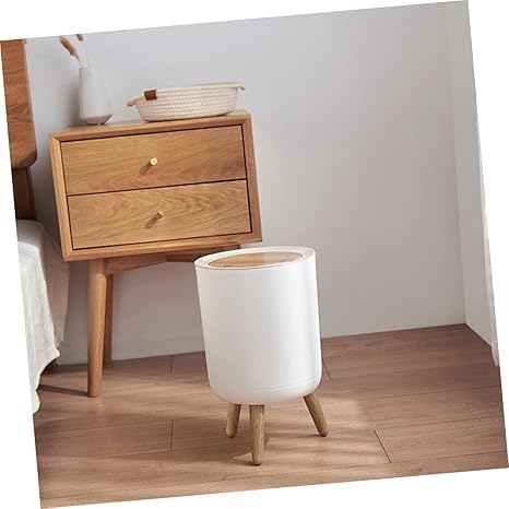 Generic - سلة مهملات بقاعدة عصرية مع أرجل خشبية، غطاء علوي يعمل بالضغط (أبيض)