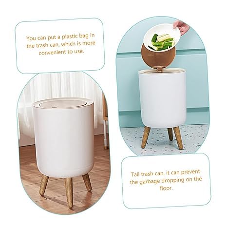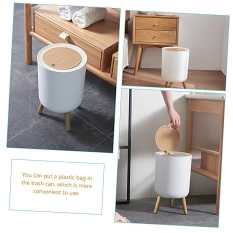 - تصميم عصري: سلة مهملات أسطوانية أنيقة مع أرجل خشبية ثلاثية القوائم وغطاء علوي يعمل بالضغط، مثالية للمساحات المنزلية والمكاتب المعاصرة