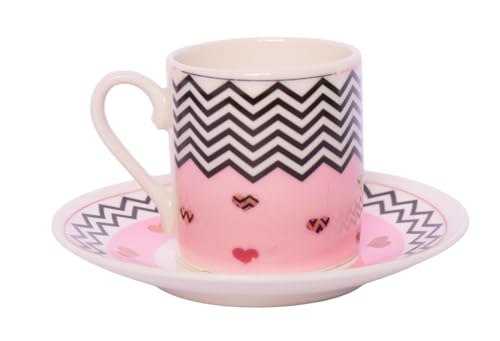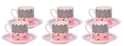 Generic - طقم فناجين قهوة بورسلين عصري مع صحن مكون من 12 قطعة - ابيض وبينك