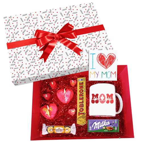 - مجموعة هدايا كاملة: صندوق هدايا عيد الأم المنسق بعناية يتميز بكوب من السيراميك بتصميم "MOM" وشوكولاتة متنوعة على شكل قلب وبار توبليرون وشوكولاتة ميلكا وبطاقة تهنئة "I Love My Mum"