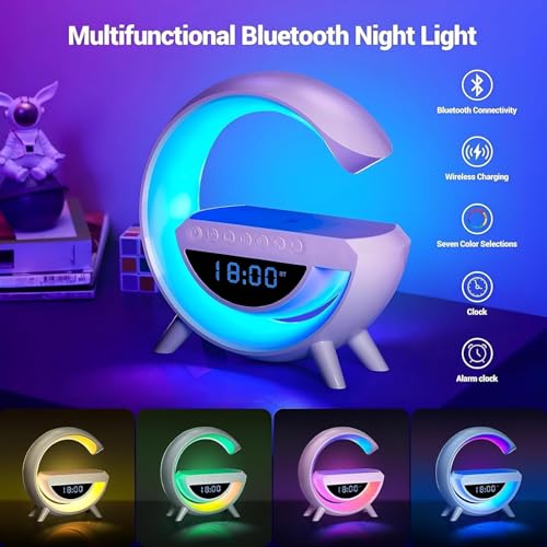 Multi Advertz - مصباح مكبر صوت بلوتوث لاسلكي قابل لاعادة الشحن على شكل G مع ساعة! مكبر صوت 3 في 1 متعدد الوظائف ! شحن سريع لاسلكي 15 واط! ضوء RGB! مصباح مكتب LED! راديو اف ام مع AUX (موديل 3)