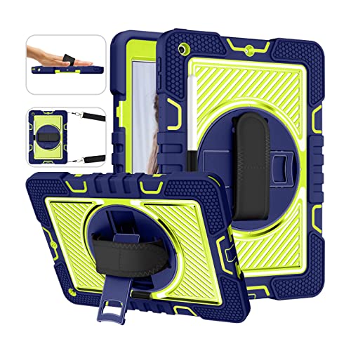 Myriadunsell - جراب حماية مضاد للصدمات لآبل آيباد 10.2 بوصة (2019/2020/2021) مع حامل دوار 360 درجة وحزام معصم وحزام كتف من ميريادونسيل، أزرق كحلي وأصفر وأخضر