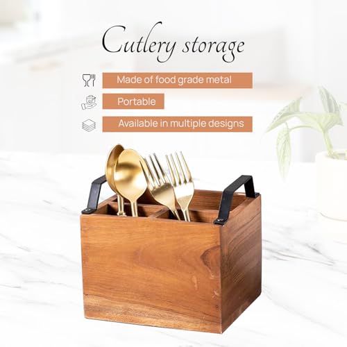 - المواد، الأبعاد، حجم الطقم: [المادة] العلبة - خشب الساج، المقابض - حديد بطلاء مسحوق أسود؛ [الأبعاد] 18 سم (طول) × 18 سم (عرض) × 14 سم (ارتفاع)، [حجم الطقم] حامل ملعقة واحد، [المنشأ] صنع بفخر في الهند.