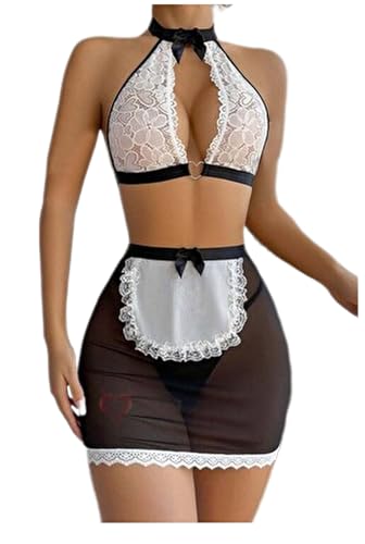 Generic - طقم لانجري تنكري "الخادمة" قطعتين NF22-1012 - صدرية دانتيل هالتر مع تنورة تل ومريلة مكشكشة