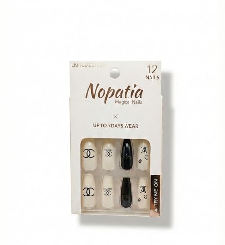 Nopatia - طقم أظافر صناعية 12 قطعة - من Nopatia تصميم بنقوش الحروف والرموز العصرية - أظافر كوفين طويلة للتركيب بالضغط تدوم حتى 7 أيام