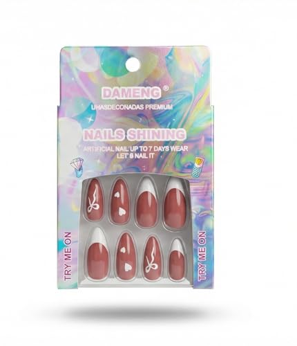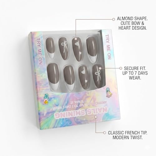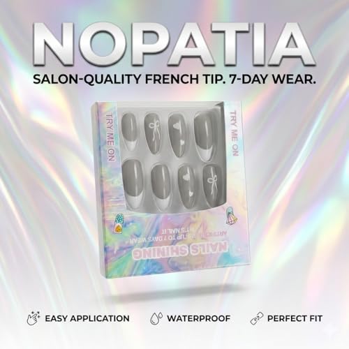 Nopatia - أظافر صناعية فاخرة من Nopatia بنمط فرنش عصري - أظافر تركيب لوزية مزينة بقلوب وفيونكات رقيقة - طقم أظافر لامعة تدوم حتى 7 أيام لإطلالة أنيقة واحترافية (شكل 1)