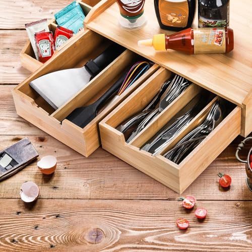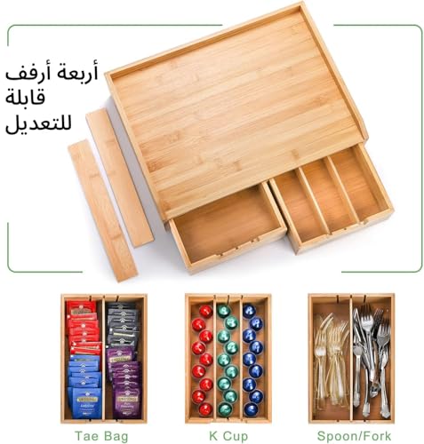 - يتضمن منظم درج من البامبو مع صندوق تخزين على الجانب. الأبعاد: 40.9 سم × 30.0 سم × 10.7 سم. يمكن أن يحمل كبسولات القهوة أو الكبسولات الصغيرة/الكبيرة أو أكواب كيه أو أكياس الشاي أو المبيض أو السكاكين والشوكة.