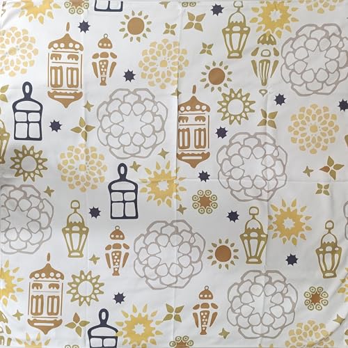 Ocra - مفرش طاولة رمضان من اوكرا، ابيض مع فانوس اسلامي ذهبي وطباعة ماندالا، مصنوع من البوليستر، غطاء طاولة للاحتفال بالعيد (غطاء 145 × 145)