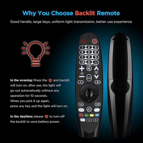 - أحدث تصميم للتحكم عن بعد بإضاءة خلفية لأجهزة تلفزيون ال جي، مع زر إضاءة، يمكنك تشغيل الضوء في ليلة مظلمة وإيقافه خلال النهار.