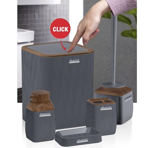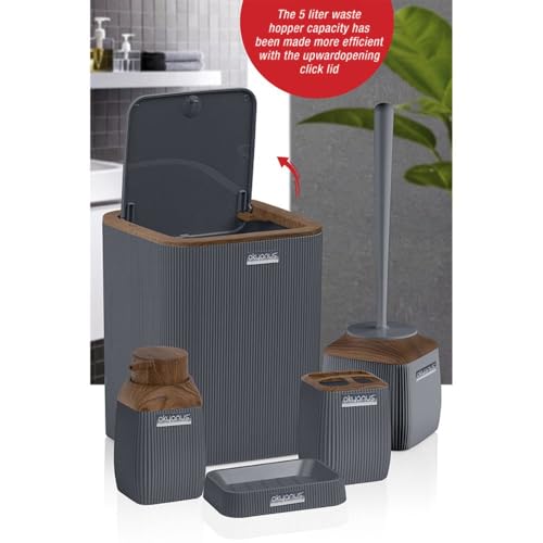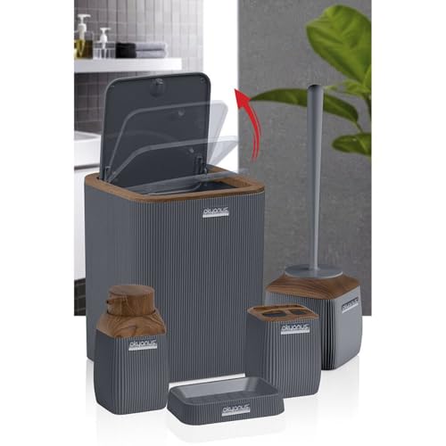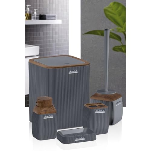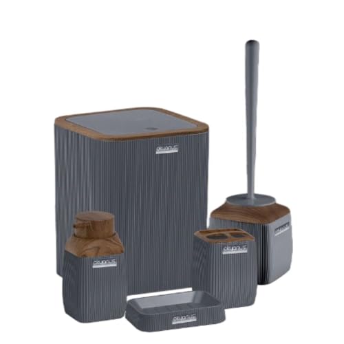 okyanus home - مجموعة اكسسوارات الحمام من الاكريليك ديفا من اوكايانوس، 5 قطع (طبق صابون، موزع صابون، سلة مهملات، فرشاة تواليت وحامل، وحامل فرشاة أسنان) (خشبي) (رمادي)