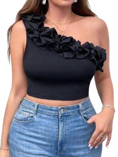 Generic - توب قصير بكتف واحد مع كشكش، أسود، قماش محبوك، ستايل عصري