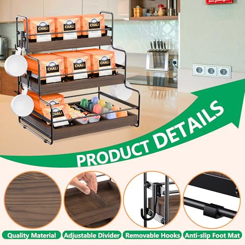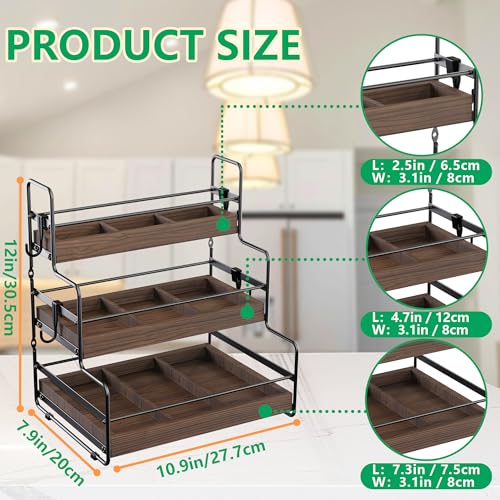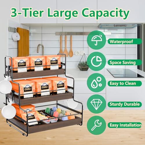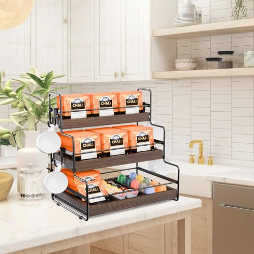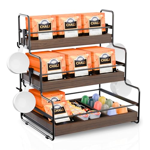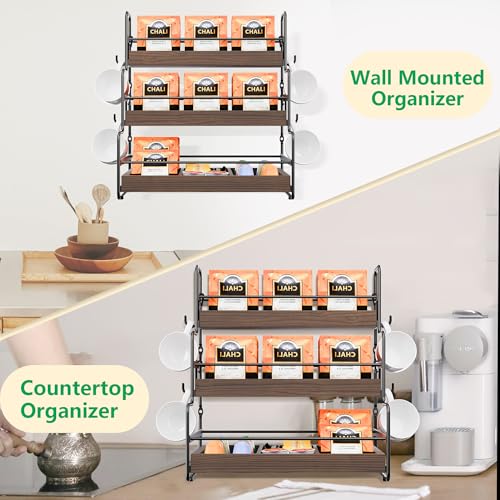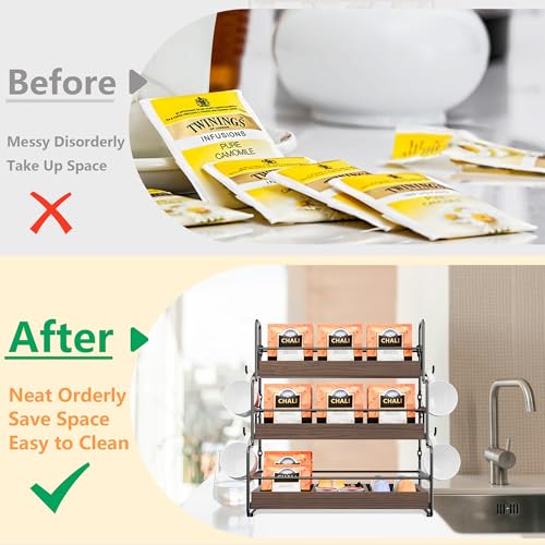 ORNAROVI - منظم اكياس الشاي من اورناروفي، منظم حامل اكياس الشاي مع فواصل وخطاف، صندوق شاي خشبي من 3 طبقات، منظمات شاي مثبتة على الحائط وبدلة تخزين للمطبخ والمقهى والمكتب (3 طبقات)