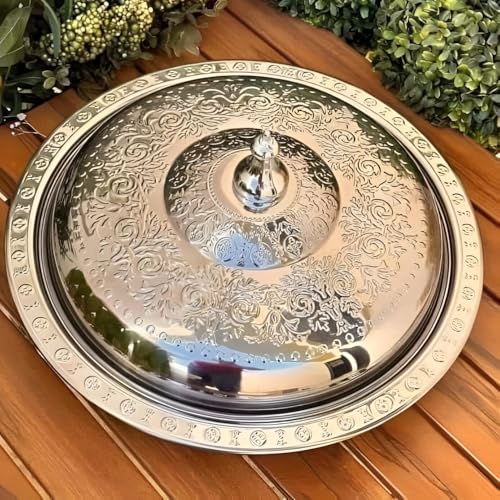 Generic - صينية تقديم من فولاذ مقاوم للصدأ بغطاء، بتصميم عثماني أنيق لتقديم الكبسة والمندي والمشويات، مقاس 35 سم، مقبض كريستالي لسهولة التقديم