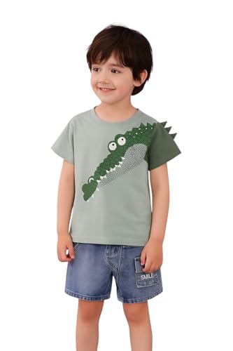 Generic - طقم خروج اولادي شورت جينز خامة رباعية كحلي فاتح وتيشرت قطن ١٠٠% زيتي برسمة4سنوات