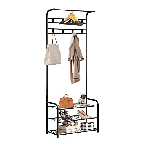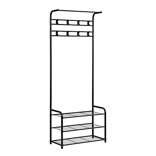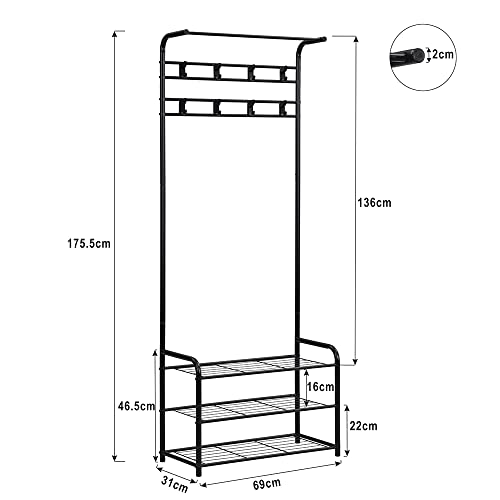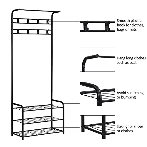 Panana - حامل معطف معدني قائم بذاته على شكل شجرة من 3 طبقات لتخزين الأحذية، 8 خطافات شماعة لتعليق المعطف والمظلة والشنطة للمدخل وغرفة النوم (نمط 02، أسود)