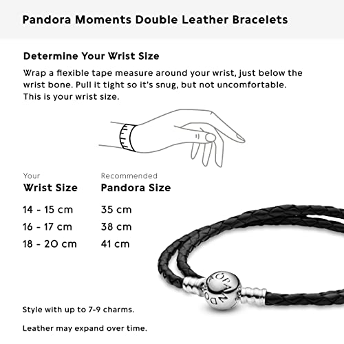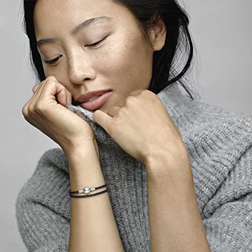 PANDORA - سوار جلد بدلاية من الفضة الاسترلينية من باندورا، لون اسود، مقاس 16.1