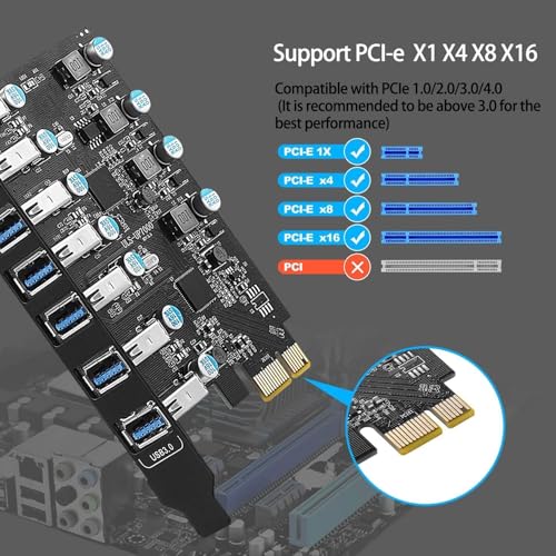- توسيع USB 3.0 بـ 7 منافذ: تضيف بطاقة توسيع منفذ الملحقات الإضافية السريع سبعة منافذ USB 3.0 إلى جهاز الكمبيوتر المكتبي الخاص بك، مما يوفر نقل بيانات عالي السرعة يصل إلى 5 جيجابت في الثانية لتوصيل العديد من الأجهزة الطرفية في وقت واحد