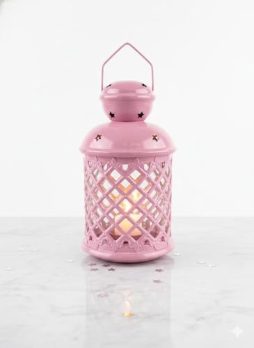 - تصميم زخرفي أنيق: فانوس وردي اللون بنمط شبكي معدني مزخرف يضيف لمسة جمالية رائعة لأي مساحة داخلية أو خارجية