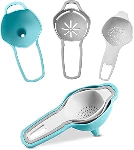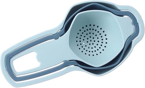 - ١) مجموعة متكاملة: تتكون من ٣ مصافي مطبخ بأحجام مختلفة بألوان أزرق ورمادي وأبيض لتلبية جميع احتياجات التصفية