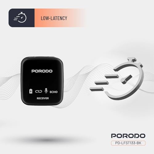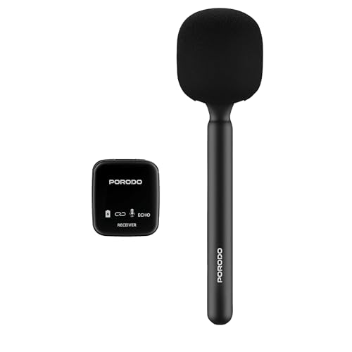 Porodo - بورودو ميكروفون وجهاز استقبال محمول باليد، متوافق مع الكاميرات الرقمية/كاميرات الفيديو، مقبس 3.5 ملم، وقت تشغيل 10-12 ساعة، بطارية 400mAh، حساسية 90 ديسيبل - اسود