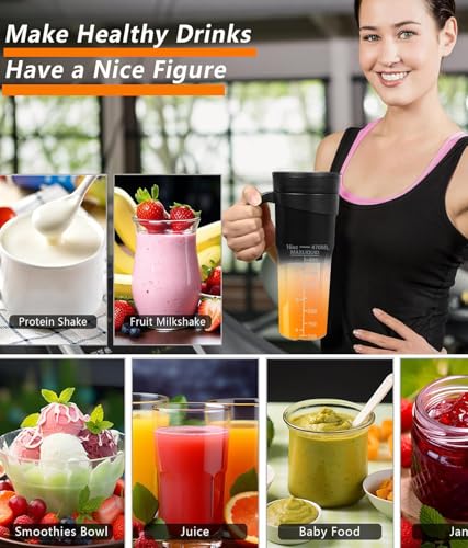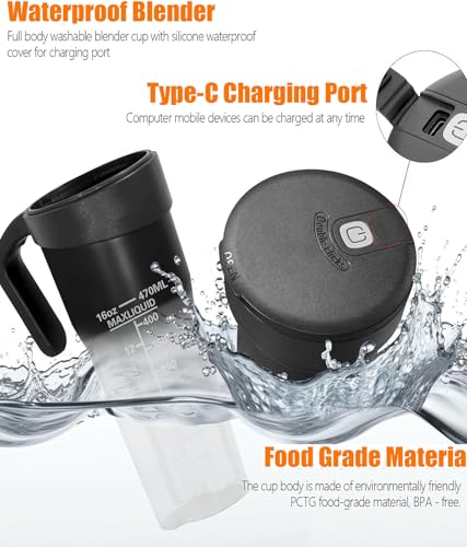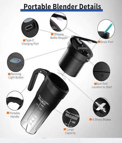 IS MUHE - خلاط محمول للمخفوقات والسموذي مع 6 شفرات حادة، خلاط صغير قابل لاعادة الشحن بمنفذ USB 470 مل، مقبض وفرش بغطاء ماصة، خلاط لاي مكان، خال من البيسفينول ايه