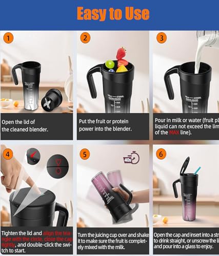 • 【حماية قفل ذكية】يتميز الخلاط المحمول للمخفوقات والعصائر بوظيفة حماية مغناطيسية مدمجة. إذا لم يتم شد الكوب أو إزالته، فلن يعمل الخلاط الشخصي بشكل صحيح. الخلاط الشخصي الخاص بنا مضاد للماء وسهل التنظيف، لا تقلق بشأن غسل جسم الكوب بالداخل.