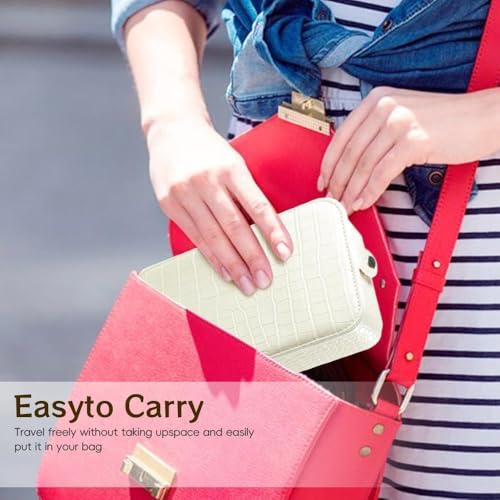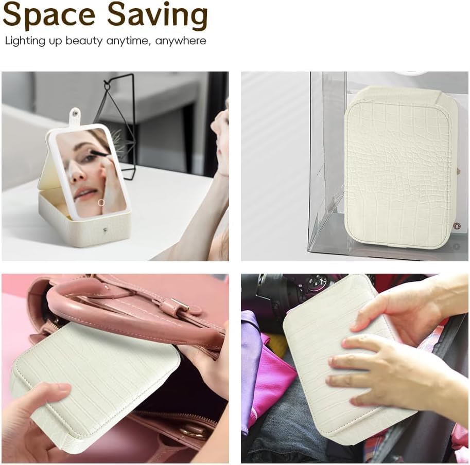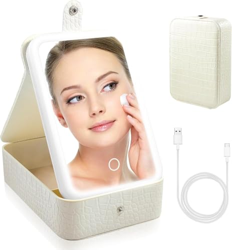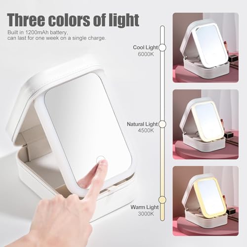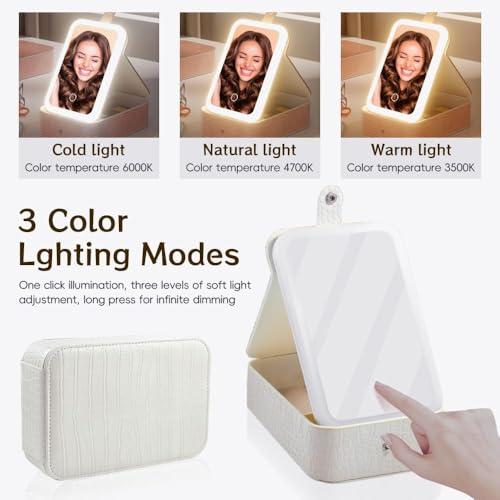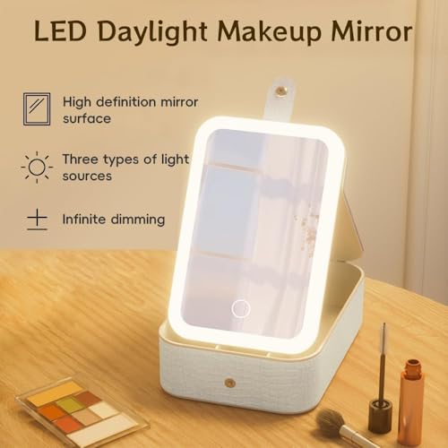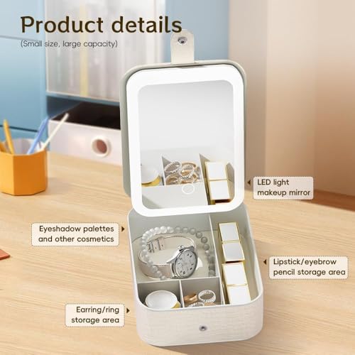 Generic - حقيبة مكياج محمولة للسفر مع مرآة LED مضيئة بثلاثة إعدادات اضائة قابلة للتعديل، منظم مستحضرات تجميل ومجوهرات للنساء، تصميم عملي وأنيق، مثالي للاستخدام أثناء التنقل والسفر (ابيض)