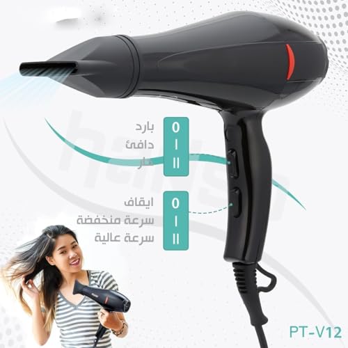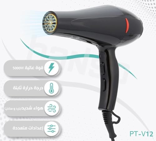 Generic - مجفف شعر PT-V12 مصنوع من البلاستيك مع إعدادات حرارة متعددة وتحكم بالسرعة ومركز قابل للفصل بقوة 5000 وات من بي تي، أسود