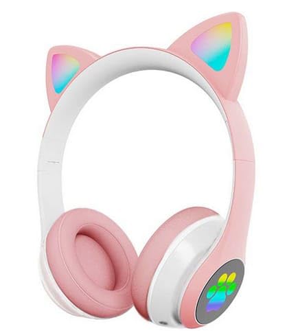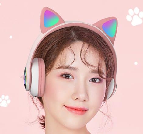 PUPZY - سماعات راس لاسلكية بتصميم اذن قطة باضاءة LED من بوبزي، سماعات بلوتوث قابلة للطي فوق الاذن مع ميكروفون للتعلم عن بعد عبر الانترنت