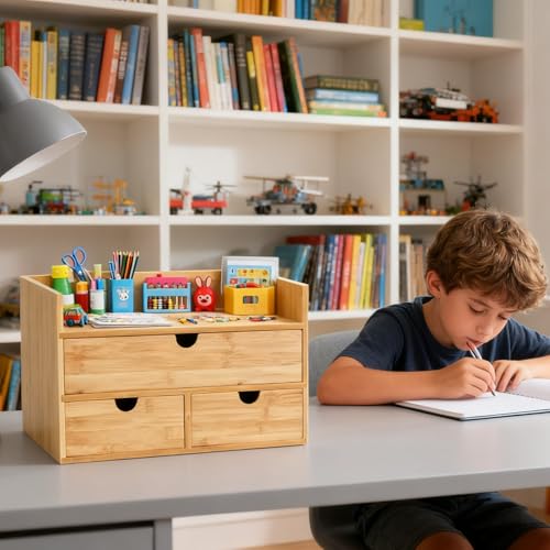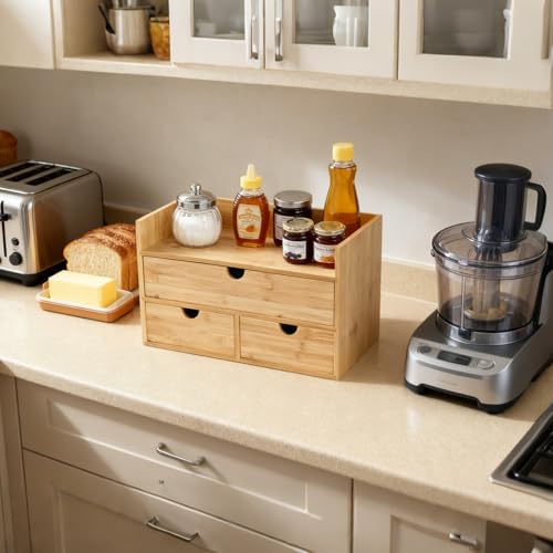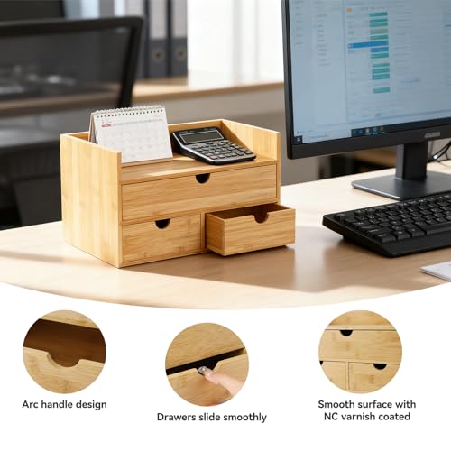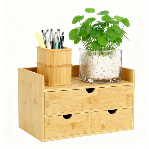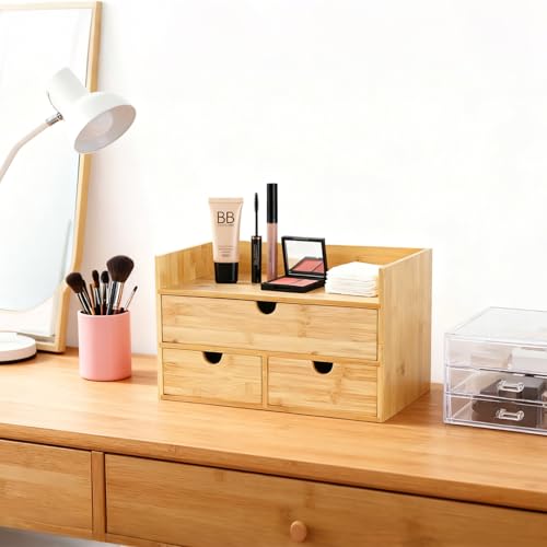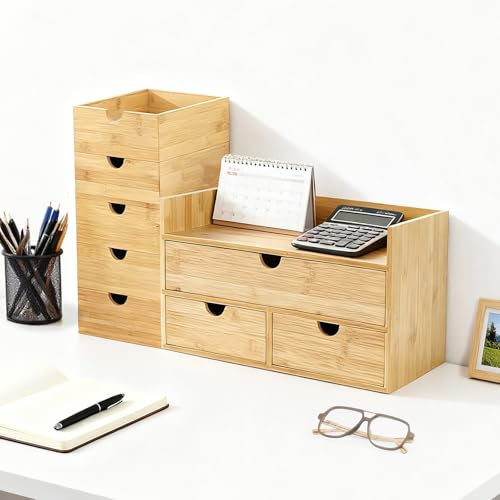QIANBAMDAY - منظم مكتب مع ادراج من كيان بامداي - منظم سطح المكتب من الخيزران للمكتب والمنزل ورف فانيتي المكياج، صندوق ادراج تخزين قابل للتكديس لتنظيم المكتب، لا يحتاج الى تجميع