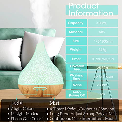 Rakoon - موزع زيوت عطري سعة 400 مل لغرفة المنزل الكبيرة مع 4 مؤقتات و15 وضع اضاءة برذاذ بارد مع ريموت كنترول وخاصية الايقاف التلقائي