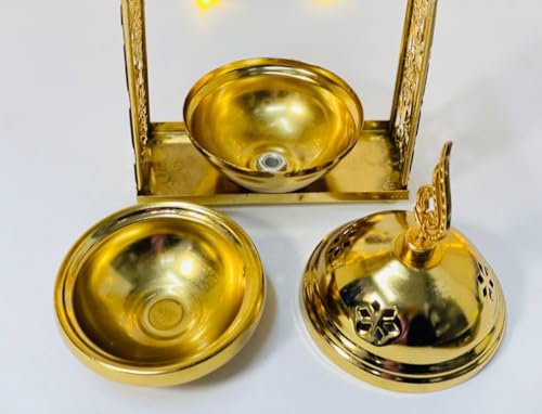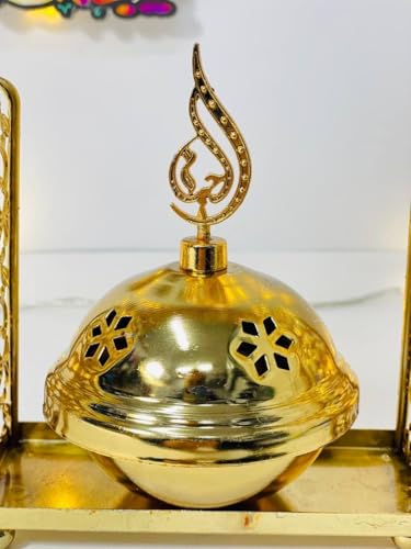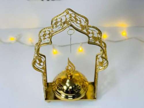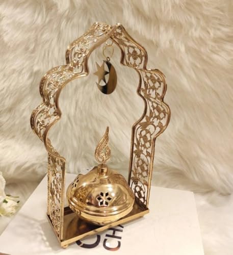 - تصميم رمضاني مميز: مبخرة معدنية ذهبية اللون مزينة بنقوش إسلامية فاخرة مع إطار على شكل قوس وتعليقة الهلال والنجمة في الأعلى