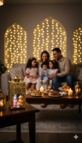 - إضاءة LED دافئة: يوفر إضاءة ناعمة ودافئة من خلال الألواح الزجاجية المزخرفة، مثالي لخلق أجواء روحانية ومريحة في المنزل أو المكتب خلال الشهر الفضيل