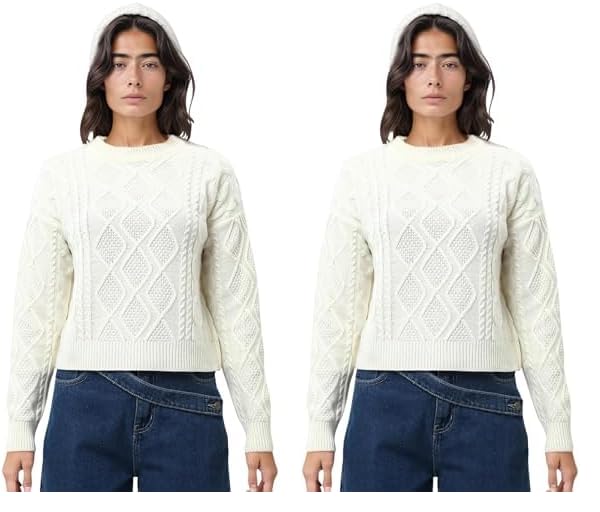 Ravin - بلوفر محبوك مع حاشية مضلعة - اوف وايت، للنساء من ريفين، أبيض، L (عبوة من قطعتين)