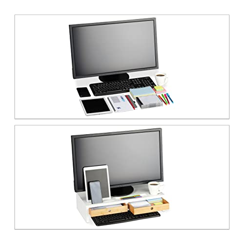 Relaxdays - حامل عرض، 2 درج، حامل شاشة الكمبيوتر، حامل مكتب، مصنوع من البامبو والخشب الليفي متوسط الكثافة من ريلاكس دايز، الارتفاع × العرض × العمق: 12 × 55.5 × 27 سم، أبيض/طبيعي، حديد، خشب ليفي متوسط الكثافة.