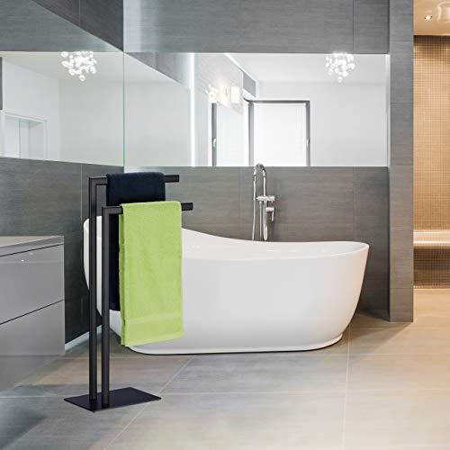 - للحمام: حامل مناشف حمام قائم مزخرف مع قضيبين، مصنوع من الستيل باللون الأسود.