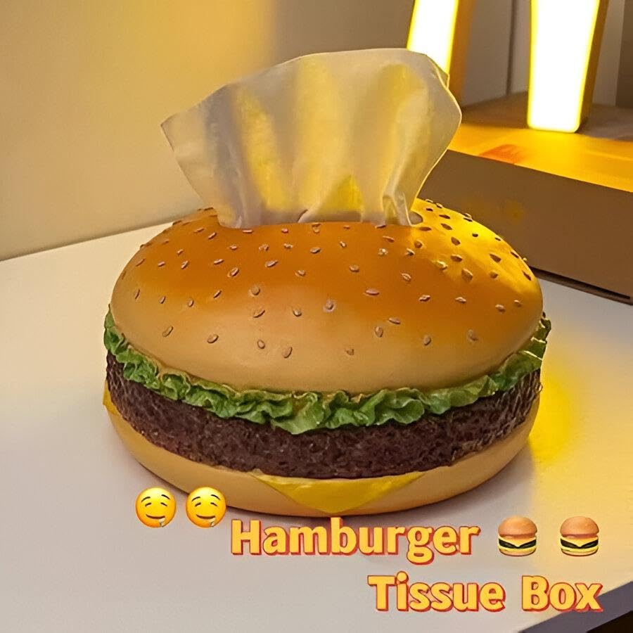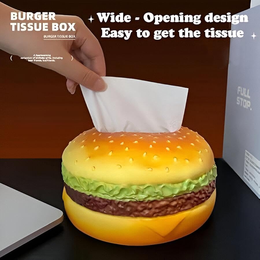 - كصندوق مناديل، يمزج موزع الراتنج على شكل برجر بين الشكل والوظيفة؛ يوفر هيكله المصنوع من الراتنج سطحًا متينًا يمكن تنظيفه بالمسح، بينما يحافظ الشكل المميز على المناديل أو المناديل في متناول اليد ويضيف اهتمامًا بصريًا إلى أي غرفة.