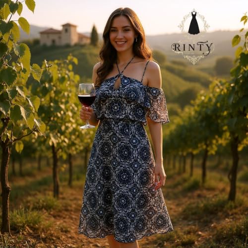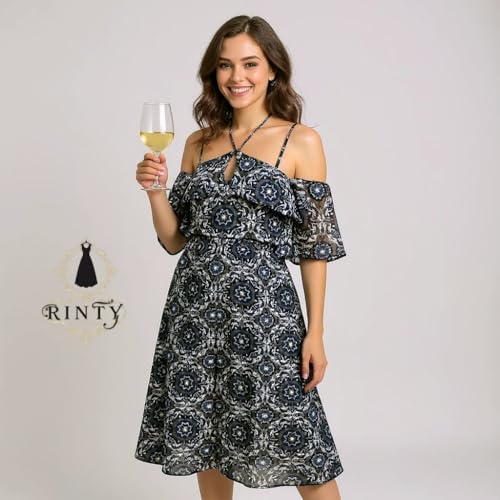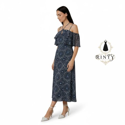 Generic - Rinty فستان نسائي طويل بنمط كاجوال، بتصميم مكشوف الأكتاف مع كشكش، نقشة هندسية باللون الأزرق الداكن