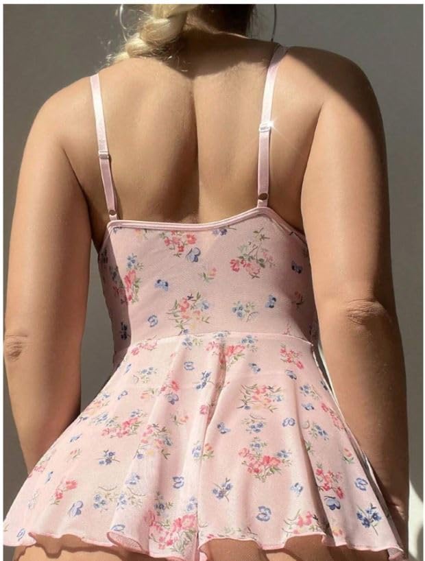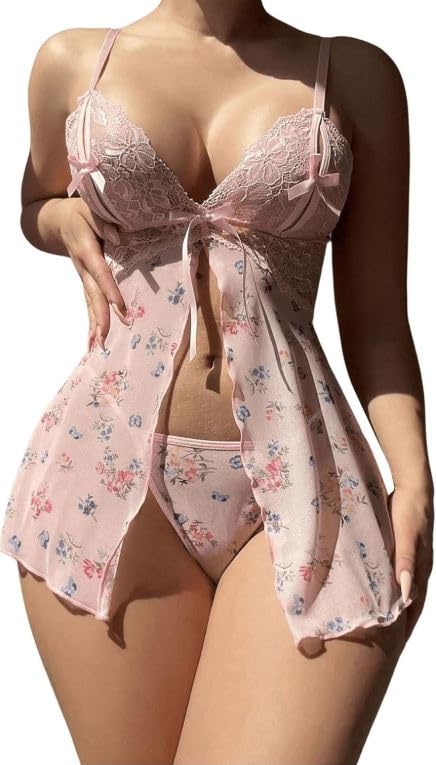 Generic - طقم فستان لانجري مثير للنساء من الدانتيل بنمط رقع شبكي رومانسي، قطعتين (بينك)