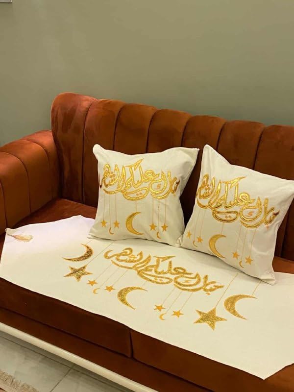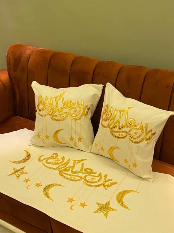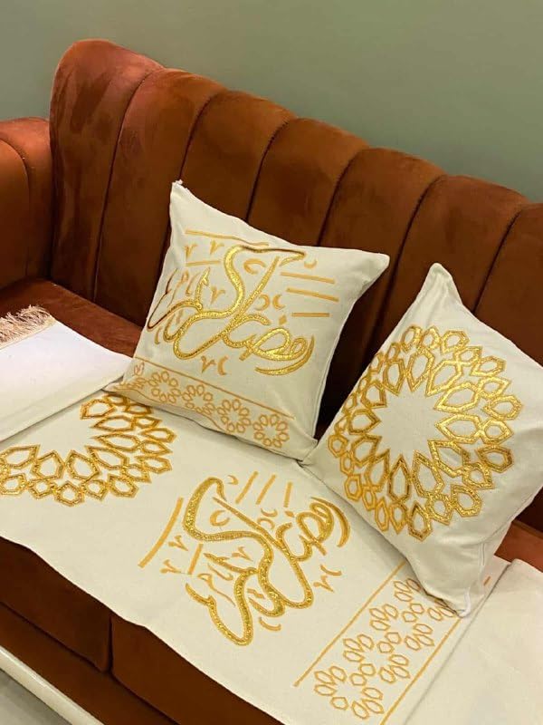 Generic - طقم مفرش بتصميم الخط العربي الذهبي والكتان ومفرش واحد مقاس 150 × 47 سم ووسادتين مقاس 45 × 45 سم، لون كريمي، .اس ار