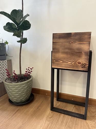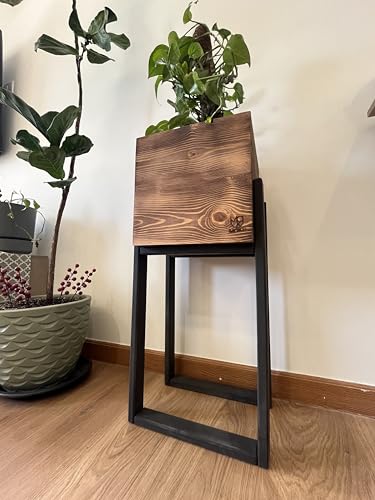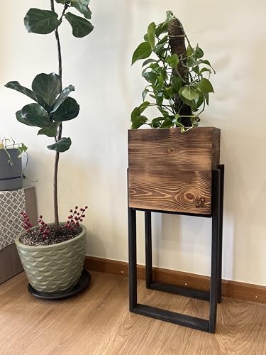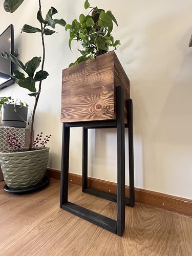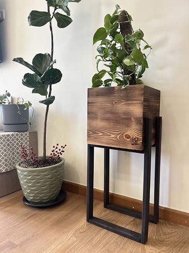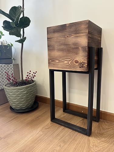 Generic - حامل نباتات خشبي ريفي مع صندوق زراعة مربع، لمسة نهائية بنية طبيعية، اطار اسود، سرير مرتفع للديكور الداخلي والخارجي