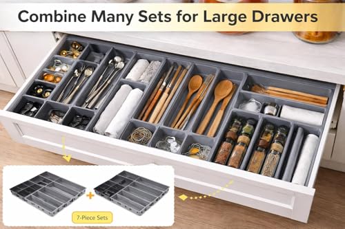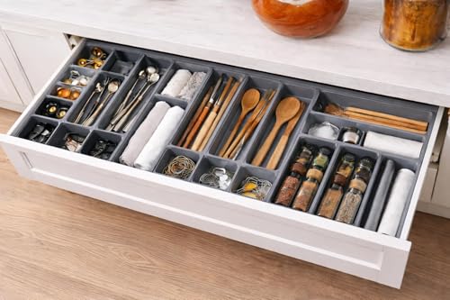Generic - مجموعة من 14 منظم ادراج فاخر قابل للسحب، صينية ادوات مائدة للمطبخ، صندوق تخزين للشوكة والسكين والملاعق والادوات المكتبية، تصميم مرن يناسب اي درج مقاس صينية بلاستيكية بلون رمادي