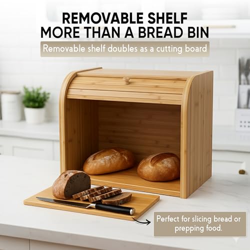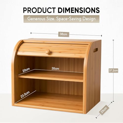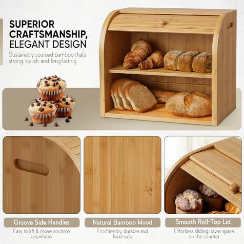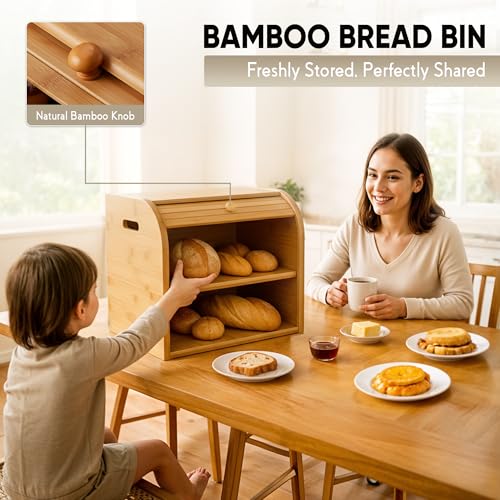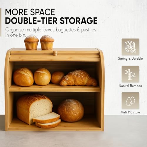 SG Traders - صندوق خبز من الخيزران بطبقتين اس جي تريدرز تخزين للمطبخ صديق للبيئة مع غطاء لتخزين الطعام الطازج والطبيعي والعضوي والمستدام كلاسيكي - خشب طبيعي