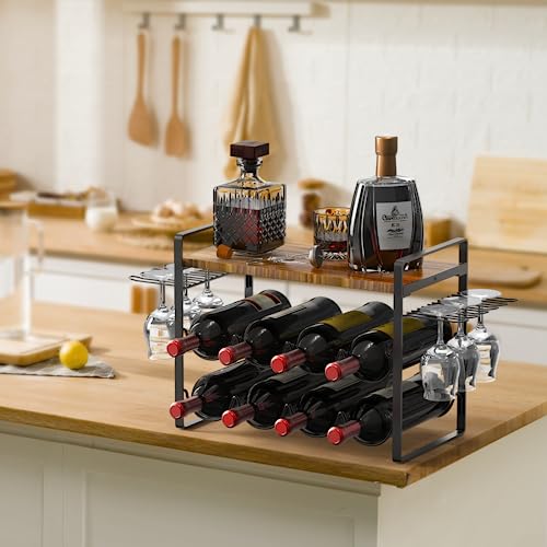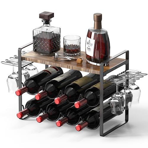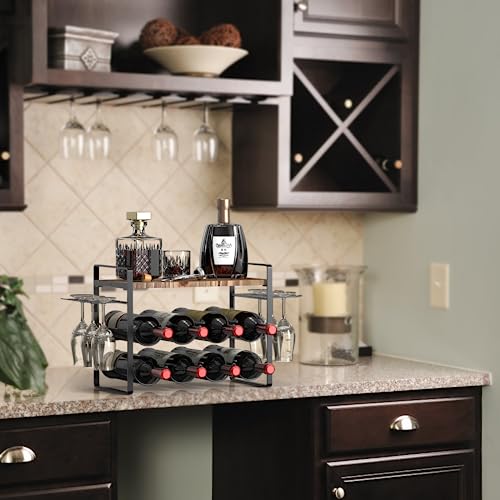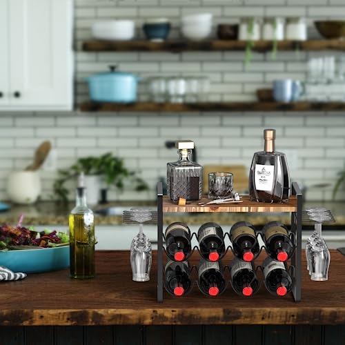 Shansis - رف خشب علوي لحفظ المشروبات مع حامل أكواب من شانسيس، إطار معدني لتخزين النبيذ مع سطح خشبي، رفوف المشروبات لسطح الطاولة للمطبخ أو بار المنزل (يسع 8 زجاجات و4-6 أكواب)