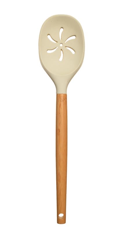 Generic - ملعقة تقديم سيليكون مثقبة بمقبض خشبي مثقب، باللون الأبيض
