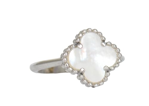 Generic - خاتم فضي بتصميم زهرة البرسيم مع صدف أبيض لؤلؤي، إطار من الخرز المعدني