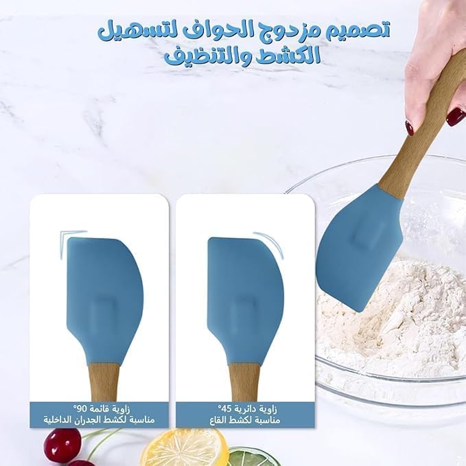 - هيكل من السيليكون المتين: مصنوع من سيليكون عالي الجودة ومقاوم للحرارة يمكنه تحمل درجات حرارة تصل إلى 450 درجة فهرنهايت، مما يجعله مثاليًا للطهي والخلط والخبز دون القلق بشأن الذوبان أو التلف.