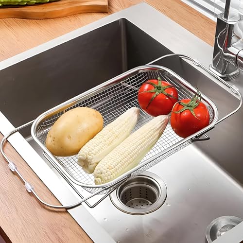 Generic - مصفاة حوض من الستانلس ستيل بتصميم شبكي ناعم وسلة تصريف وتجفيف قابل للتوسيع لاستخدامات متعددة مثل شطف الخضروات والفواكه