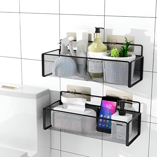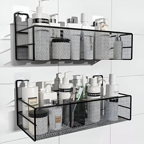 Daga - سلة حمام من الفولاذ المقاوم للصدأ مع خطافين بلاصق بوجهين للتعليق بدون مسامير، أسود، 36 × 15 × 15 سم