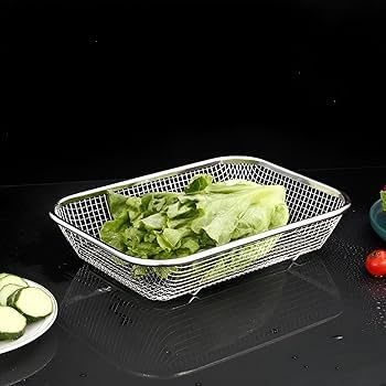 - مصفاة فوق الحوض مصنوعة من الستانلس ستيل تتميز بسلة شبكية مستطيلة، تدعم مهام الترشيح والتصريف والتجفيف والتصريف. صينية التنقيط المرفقة تلتقط الماء، وحامل ملعقة مدمج يحافظ على الأدوات مريحة، مما يحول منطقة الحوض إلى محطة تجفيف فعالة مع صينية تنقيط كبيرة.